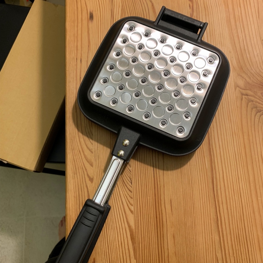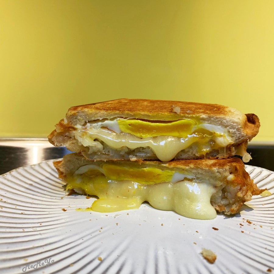 荷包蛋跟薯餅各自使用拆開的兩面熱烤麵包夾煎好,方便極了!!!!
